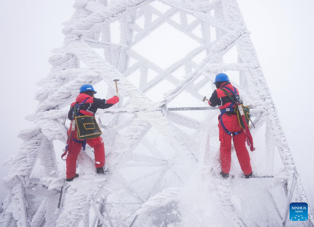 Workers deice on a power tower in Zouma Town of Hefeng County, central China's Hubei Province, Jan. 21, 2026. Facing widespread low-temperature with severe icing on power lines in some high-altitude areas in Hubei Province, power maintenance staff conducted patrols to ensure the stable operation of the power grid. (Photo by Qin Tao/Xinhua)