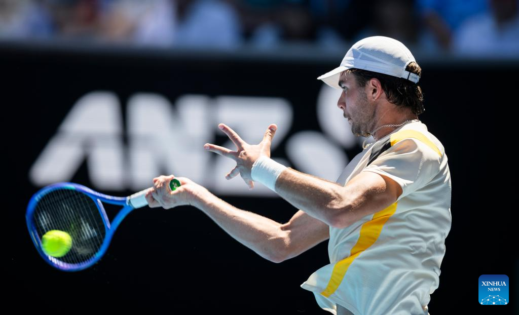 Jaime Faria of Portugal hits a return during the men's singles 2nd round match against Andrey Rublev of Russia at the Australian Open tennis tournament in Melbourne, Australia, Jan. 21, 2026 (Photo by Hu Jingchen/Xinhua)
