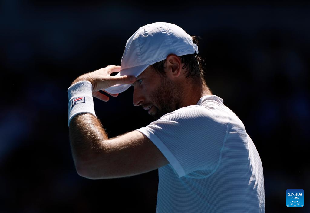 Quentin Halys of France reacts during the men's singles 2nd round match between Daniil Medvedev of Russia and Quentin Halys of France at the Australian Open tennis tournament in Melbourne, Australia, Jan. 21, 2026. (Xinhua/Ma Ping)