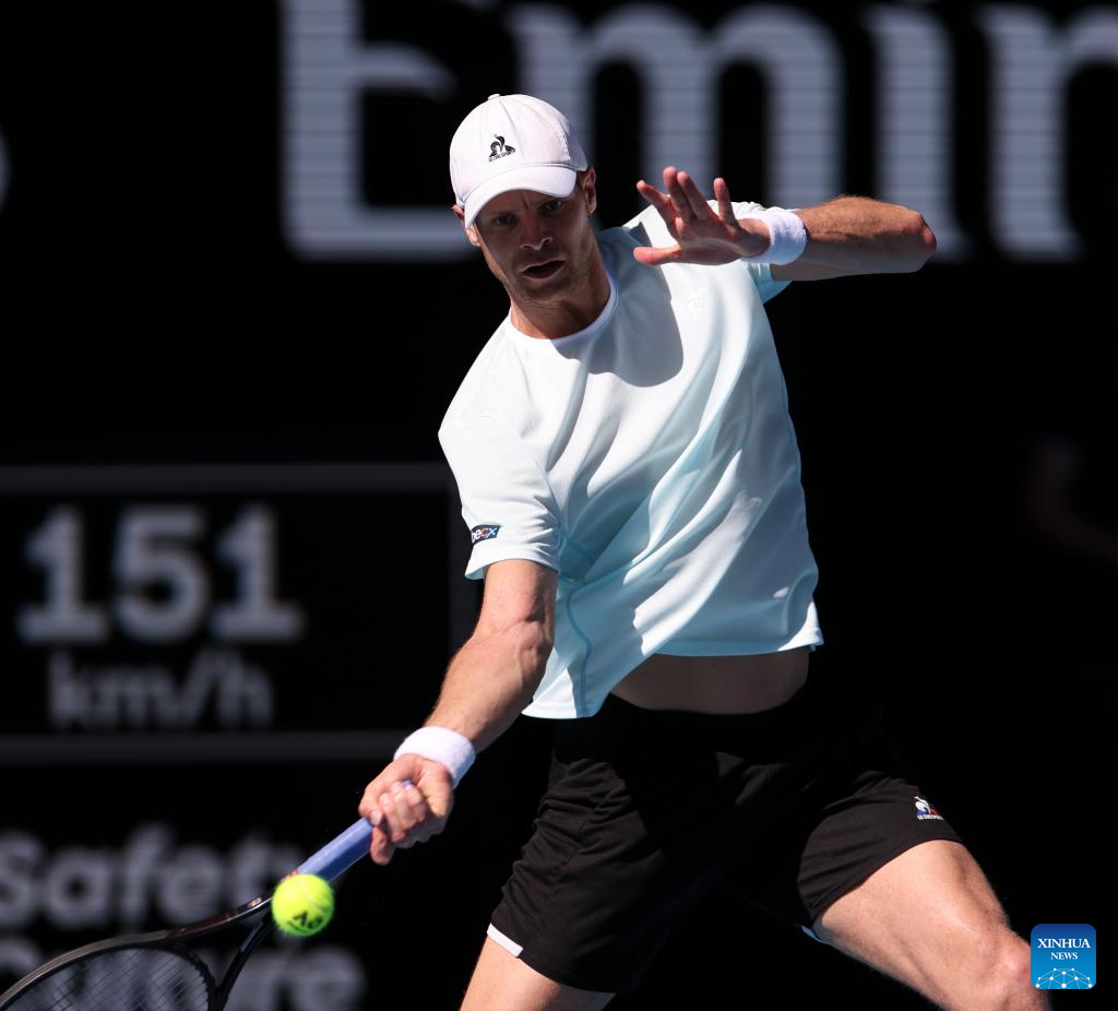 Yannick Hanfmann of Germany hits a return during the men's singles 2nd round match against Carlos Alcaraz of Spain at the Australian Open tennis tournament in Melbourne, Australia, Jan. 21, 2026. (Xinhua/Ma Ping)