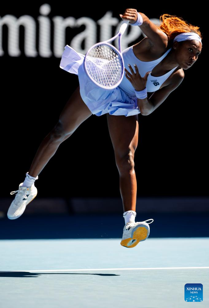 Coco Gauff of the United States hits a return during the women's singles 2nd round match against Olga Danilovic of Serbia at the Australian Open tennis tournament in Melbourne, Australia, Jan. 21, 2026. (Xinhua/Ma Ping)