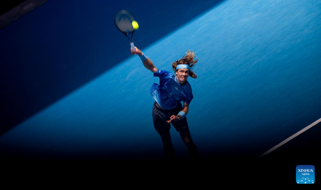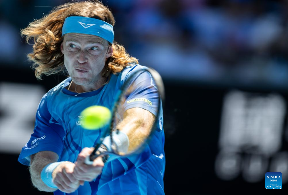 Andrey Rublev of Russia hits a return during the men's singles 2nd round match against Jaime Faria of Portugal at the Australian Open tennis tournament in Melbourne, Australia, Jan. 21, 2026 (Photo by Hu Jingchen/Xinhua)