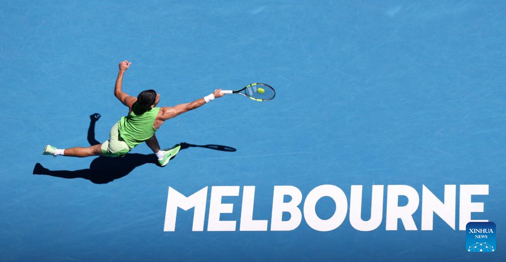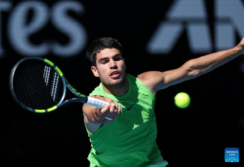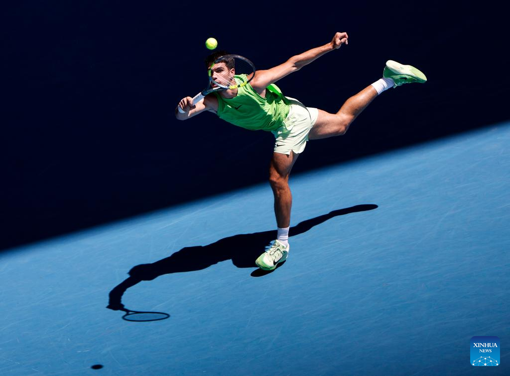 Carlos Alcaraz of Spain hits a return during the men's singles 2nd round match against Yannick Hanfmann of Germany at the Australian Open tennis tournament in Melbourne, Australia, Jan. 21, 2026. (Xinhua/Ma Ping)
