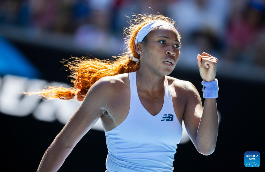 Coco Gauff of the United States celebrates scoring during the women's singles 2nd round match against Olga Danilovic of Serbia at the Australian Open tennis tournament in Melbourne, Australia, Jan. 21, 2026. (Photo by Hu Jingchen/Xinhua)