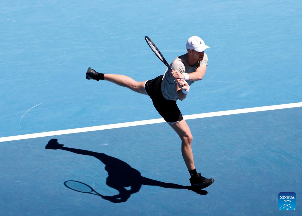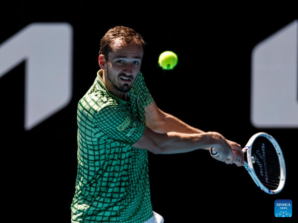 Daniil Medvedev of Russia hits a return during the men's singles 2nd round match between Daniil Medvedev of Russia and Quentin Halys of France at the Australian Open tennis tournament in Melbourne, Australia, Jan. 21, 2026. (Xinhua/Ma Ping)