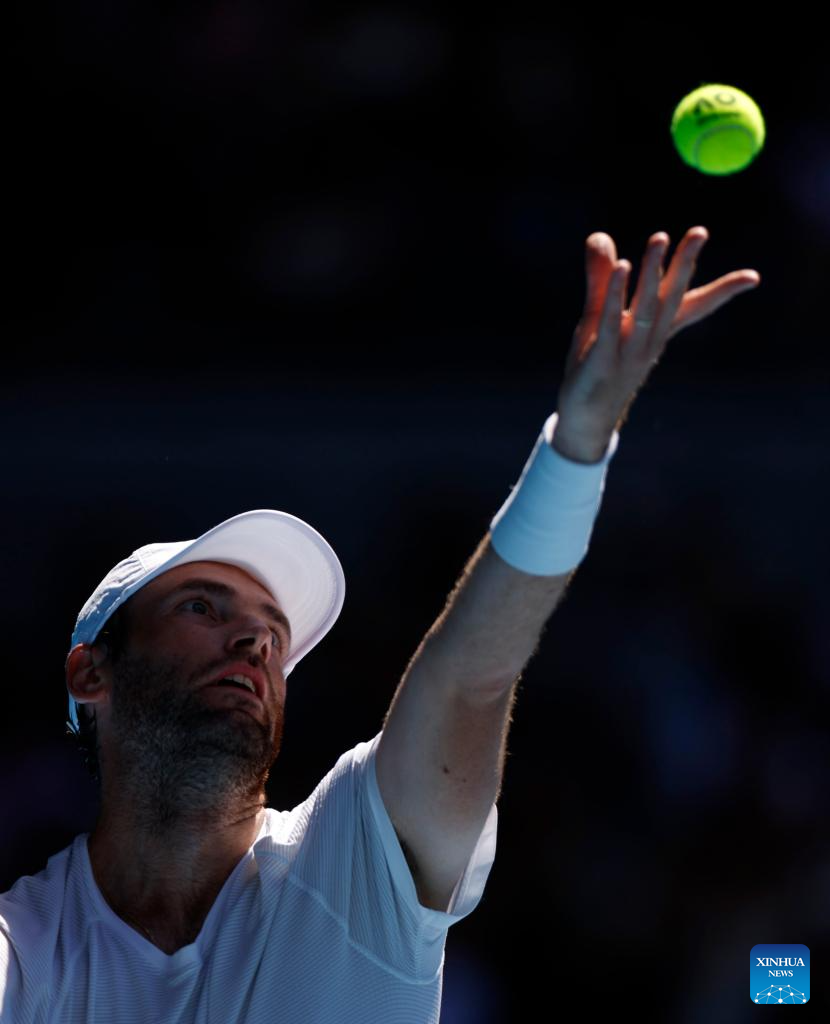 Quentin Halys of France serves during the men's singles 2nd round match between Daniil Medvedev of Russia and Quentin Halys of France at the Australian Open tennis tournament in Melbourne, Australia, Jan. 21, 2026. (Xinhua/Ma Ping)