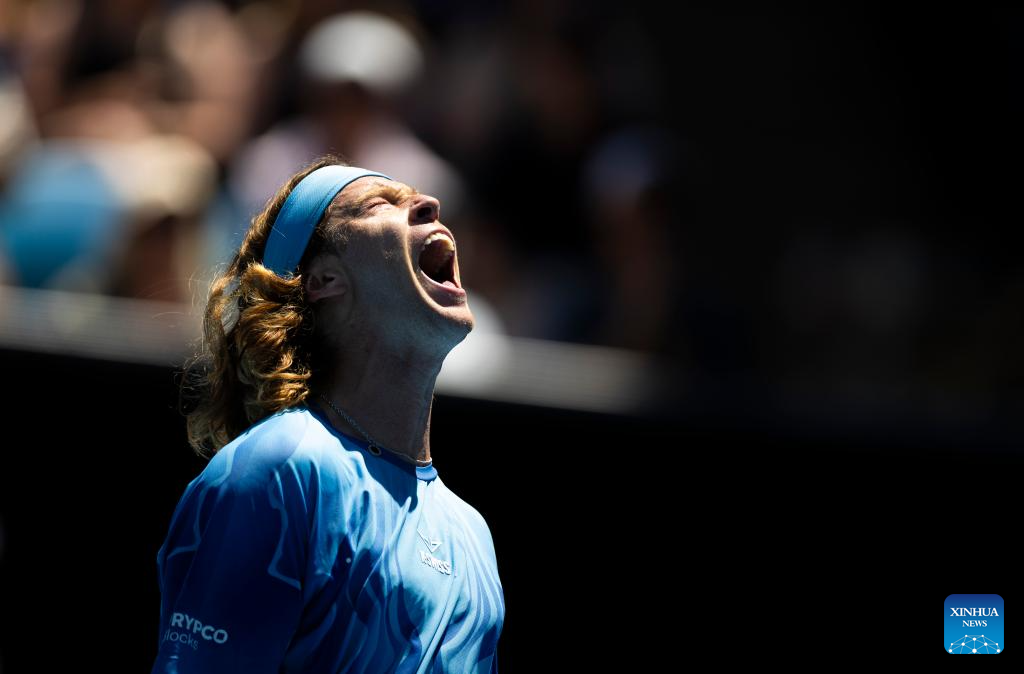 Andrey Rublev of Russia celebrates scoring during the men's singles 2nd round match against Jaime Faria of Portugal at the Australian Open tennis tournament in Melbourne, Australia, Jan. 21, 2026 (Photo by Hu Jingchen/Xinhua)