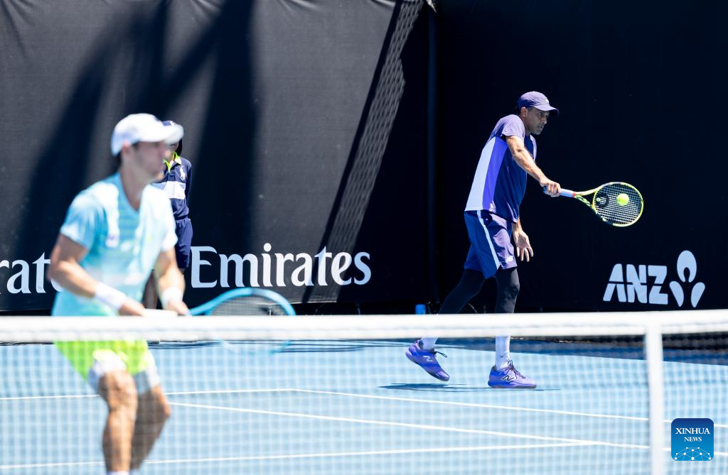 Rajeev Ram (R) of the United States/Matthew Ebden of Australia compete during the men's doubles 1st round match against Zhang Zhizhen/Shang Juncheng of China at the Australian Open tennis tournament in Melbourne, Australia, Jan. 21, 2026. (Photo by Hu Jingchen/Xinhua)