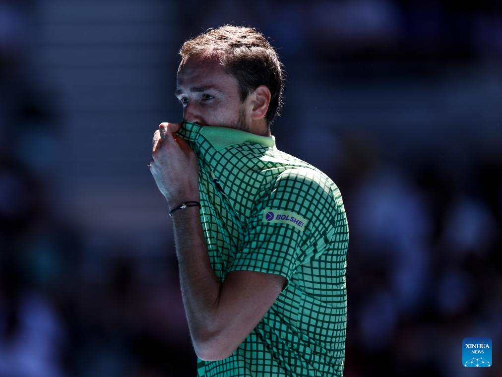 Daniil Medvedev of Russia reacts during the men's singles 2nd round match between Daniil Medvedev of Russia and Quentin Halys of France at the Australian Open tennis tournament in Melbourne, Australia, Jan. 21, 2026. (Xinhua/Ma Ping)