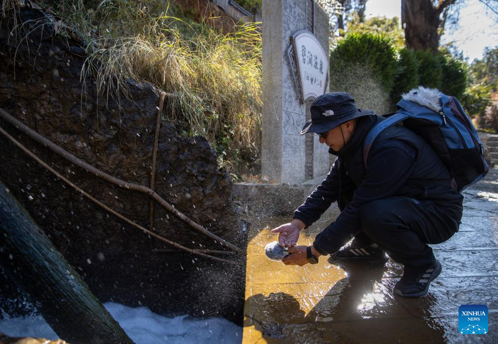 He Dehua collects the sounds of flowing water at a park at the ancient city of Lijiang, southwest China's Yunnan Province, Jan. 16, 2026. (Xinhua/Jiang Wenyao)