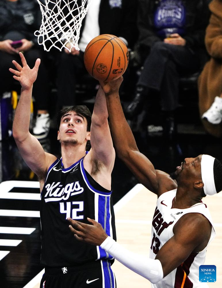 Sacramento Kings' Maxime Raynaud (L) competes during the 2025-2026 NBA regular season basketball game between Miami Heats and Sacramento Kings in Sacramento, the United States, Jan. 20, 2026. (Xinhua/Wu Xiaoling)