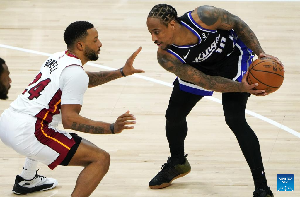 Sacramento Kings' DeMar DeRozan (R) competes during the 2025-2026 NBA regular season basketball game between Miami Heats and Sacramento Kings in Sacramento, the United States, Jan. 20, 2026. (Xinhua/Wu Xiaoling)