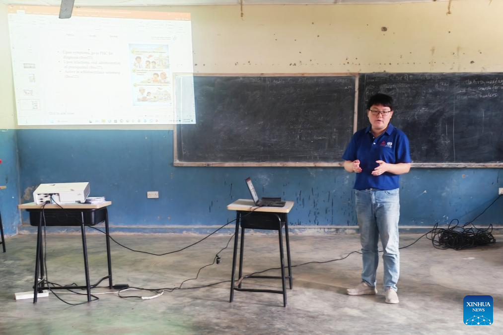 A member of the expert team of the China-aided Zanzibar schistosomiasis prevention and control project conducts a health lecture on Pemba Island of Zanzibar, Tanzania, on Jan. 20, 2026. Chinese medical experts on Tuesday launched the "100 Medical Teams in 1,000 Villages" free medical services program at a community health service center on Pemba Island in Tanzania's Zanzibar. (The expert team of the China-aided Zanzibar schistosomiasis prevention and control project/Handout via Xinhua)