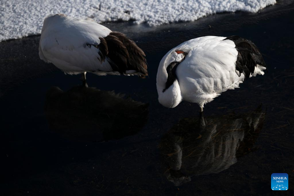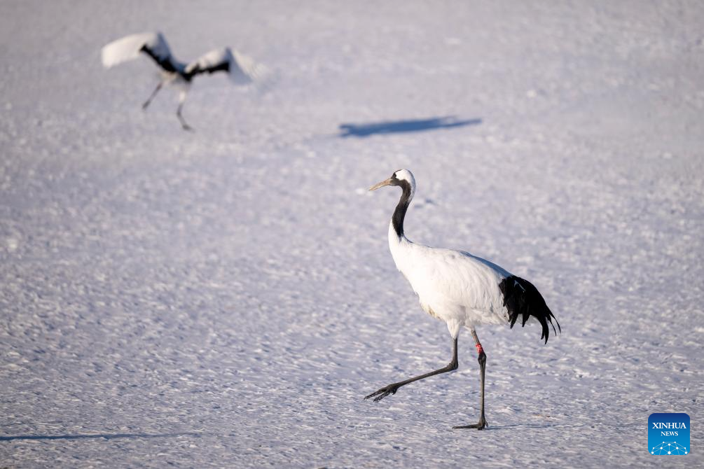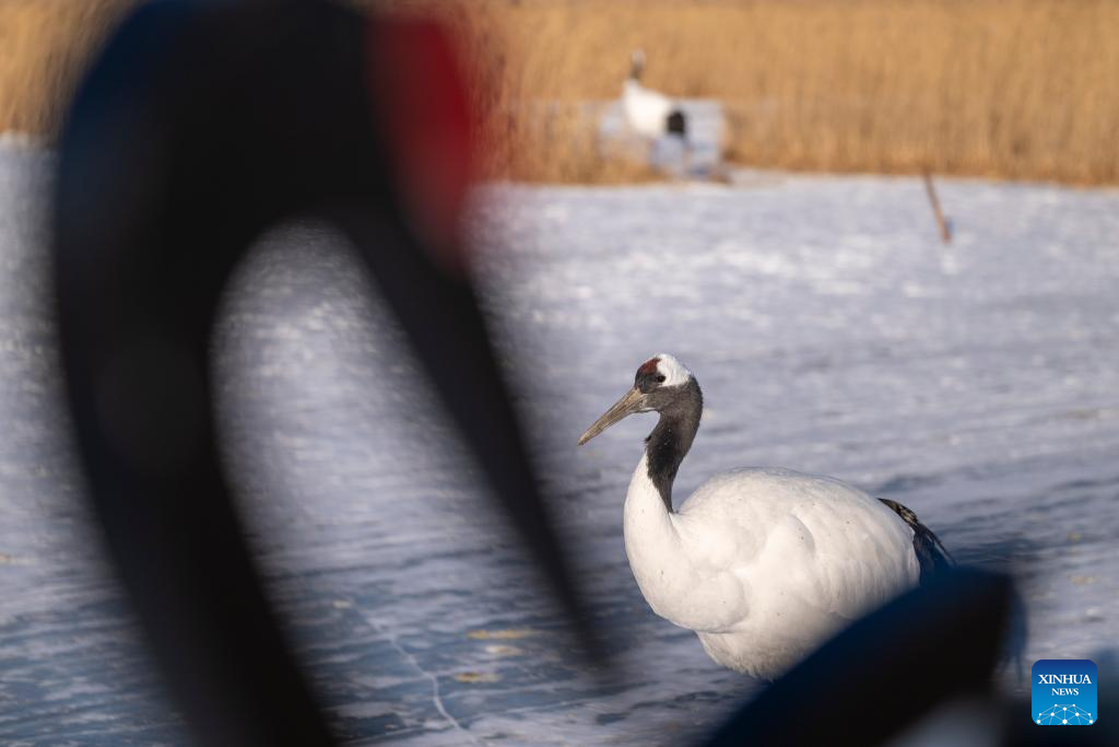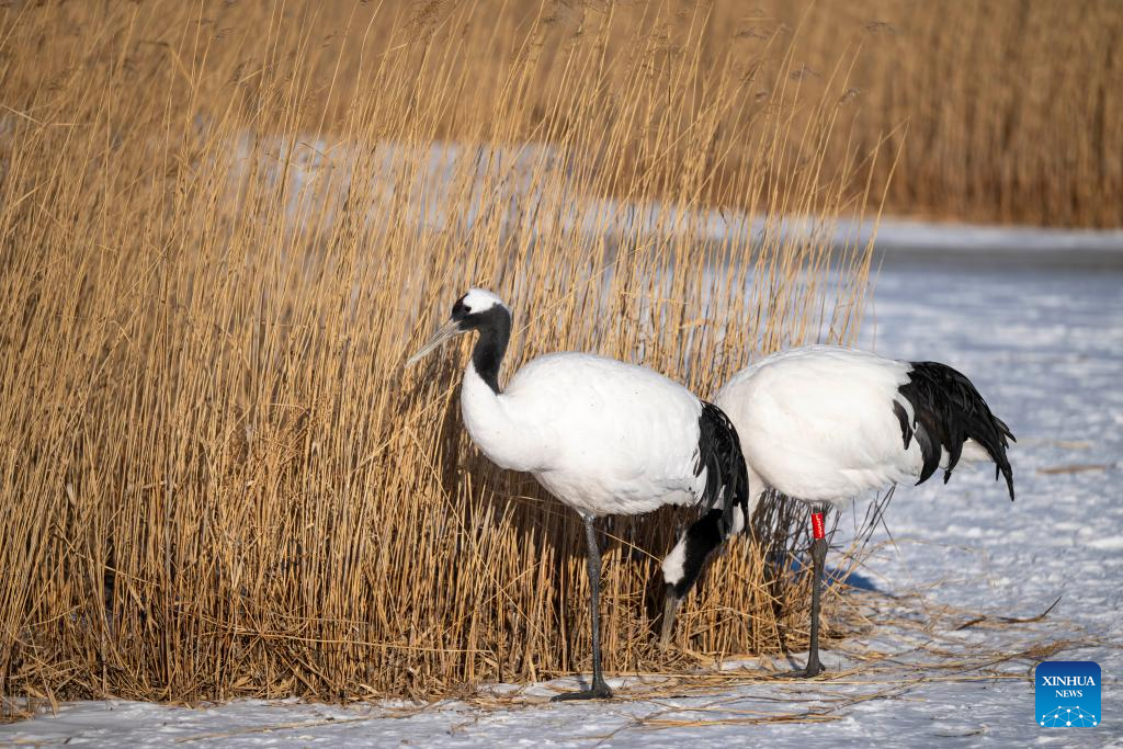 Red-crowned cranes are pictured at the Zhalong National Nature Reserve in northeast China's Heilongjiang Province, Jan. 21, 2026. (Xinhua/Zhang Tao)