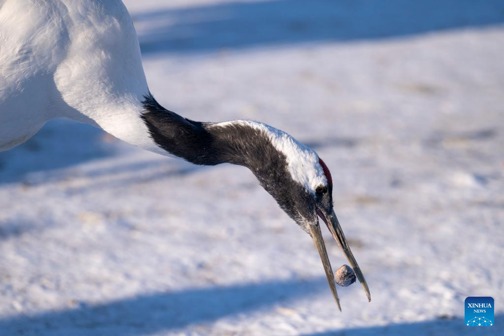 A red-crowned crane forages at the Zhalong National Nature Reserve in northeast China's Heilongjiang Province, Jan. 21, 2026. (Xinhua/Zhang Tao)