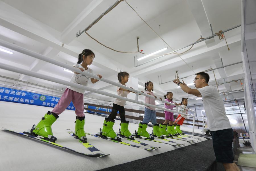 Children learn skiing as part of a summer caring program at a primary school in Shenyang, northeast China's Liaoning Province, Aug. 4, 2022. (Xinhua/Wang Yijie)