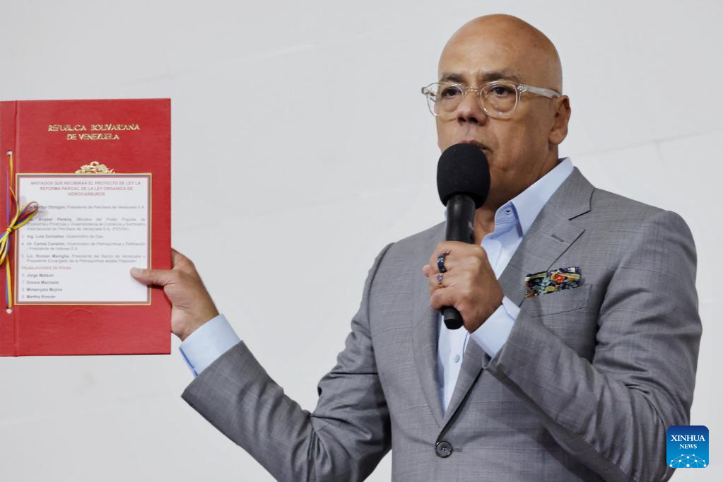 Jorge Rodriguez, President of the National Assembly, holds documents related to the reform of hydrocarbons law, in Caracas, capital of Venezuela, Jan. 29, 2026. Venezuela's National Assembly on Thursday passed a partial reform of the Organic Law on Hydrocarbons proposed by the country's acting president Delcy Rodriguez earlier this month. (National Assembly of Venezuela/Handout via Xinhua)