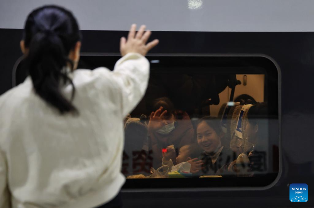 Passengers wave goodbye to their relative at Shenzhen North Railway Station in Shenzhen, south China's Guangdong Province, Feb. 2, 2026. China ushered in its largest annual population migration on Monday, 15 days ahead of the 2026 Spring Festival, also known as the Chinese New Year.