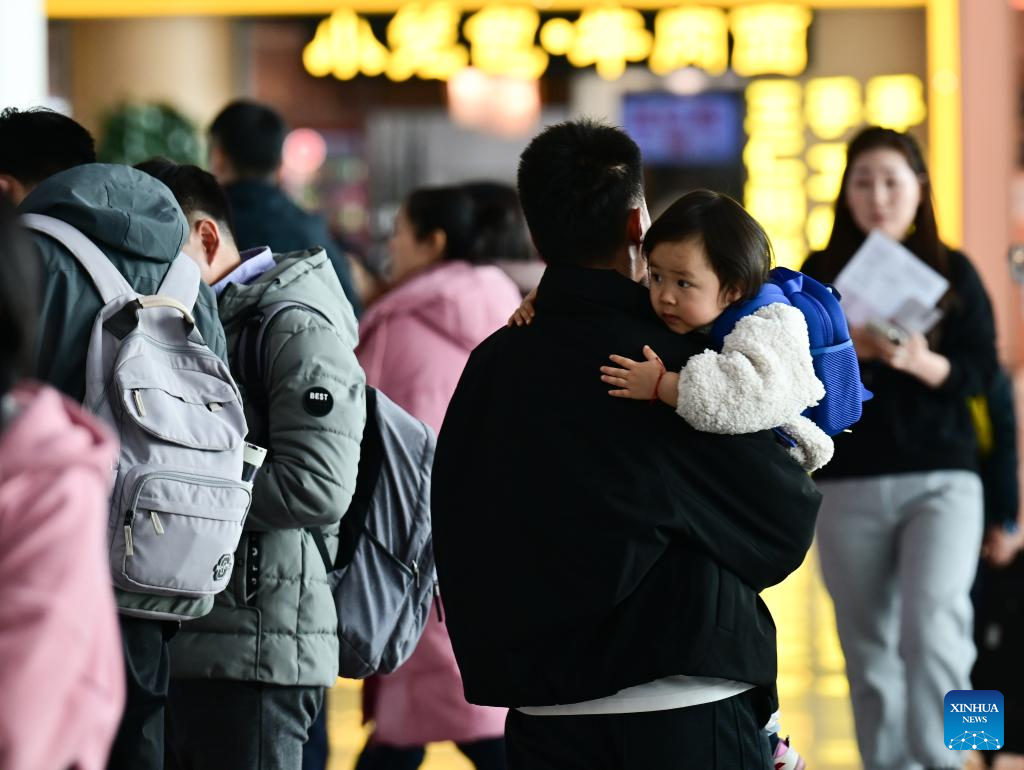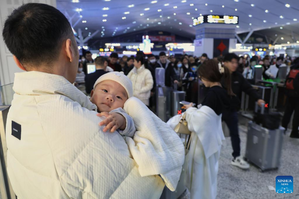 A man holding an infant is pictured at Shenzhen North Railway Station in Shenzhen, south China's Guangdong Province, Feb. 2, 2026. China ushered in its largest annual population migration on Monday, 15 days ahead of the 2026 Spring Festival, also known as the Chinese New Year.