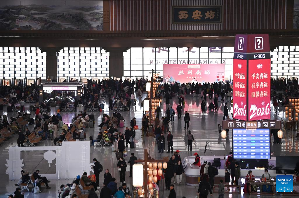 Passengers are pictured at the departure hall of Xi'an Railway Station in Xi'an, northwest China's Shaanxi Province, Feb. 2, 2026. China ushered in its largest annual population migration on Monday, 15 days ahead of the 2026 Spring Festival, also known as the Chinese New Year.