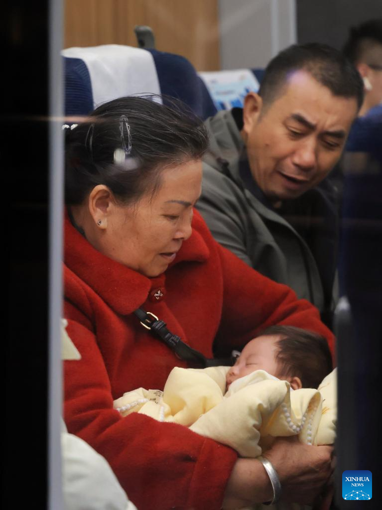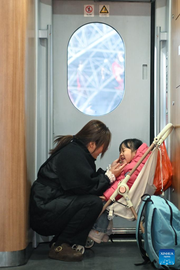 A woman takes care of an infant on a train at Shenzhen North Railway Station in Shenzhen, south China's Guangdong Province, Feb. 2, 2026. China ushered in its largest annual population migration on Monday, 15 days ahead of the 2026 Spring Festival, also known as the Chinese New Year.