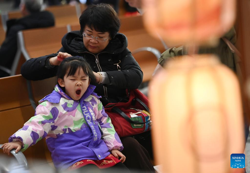 A woman combs a girl's hair at the departure hall of Xi'an Railway Station in Xi'an, northwest China's Shaanxi Province, Feb. 2, 2026. China ushered in its largest annual population migration on Monday, 15 days ahead of the 2026 Spring Festival, also known as the Chinese New Year.