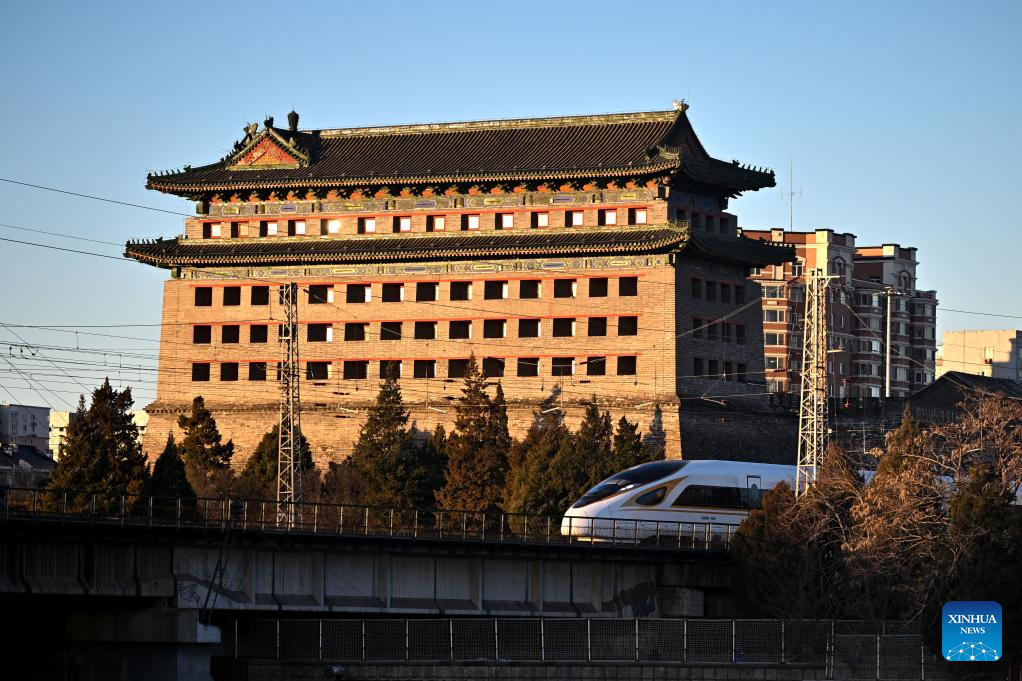 A high-speed train runs in downtown Beijing, capital of China, Feb. 2, 2026.