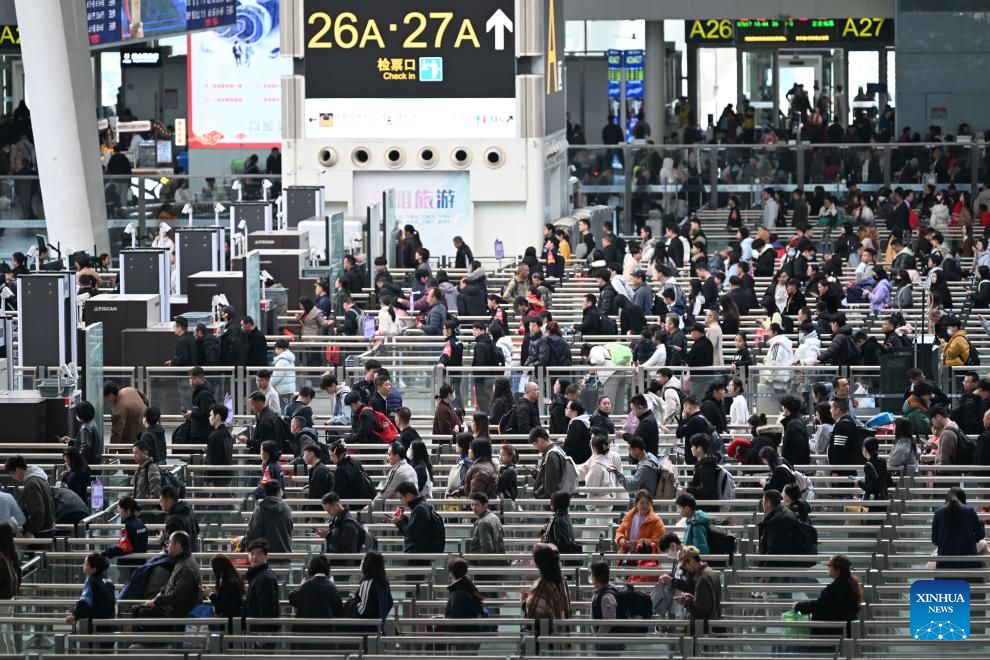 Passengers line up for security check at Guangzhou South Railway Station in Guangzhou, south China's Guangdong Province, Feb. 2, 2026.