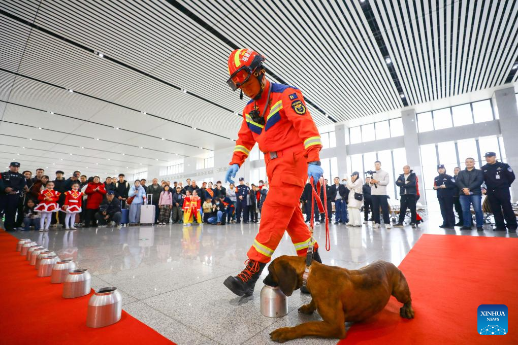 A firefighter performs a demonstration with an explosive ordnance disposal dog at Sanming North Railway Station in Sanming, southeast China's Fujian Province, Feb. 2, 2026. China ushered in its largest annual population migration on Monday, 15 days ahead of the 2026 Spring Festival, also known as the Chinese New Year.
