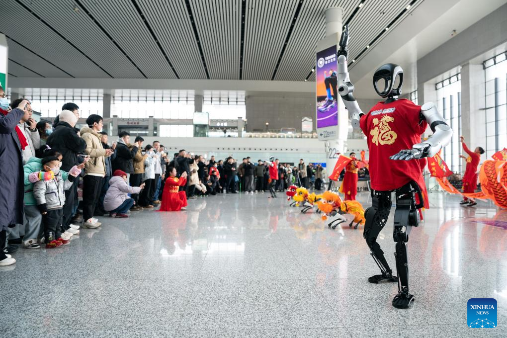 Passengers watch a robot performance at Hefei South Railway Station in Hefei, east China's Anhui Province, Feb. 2, 2026.