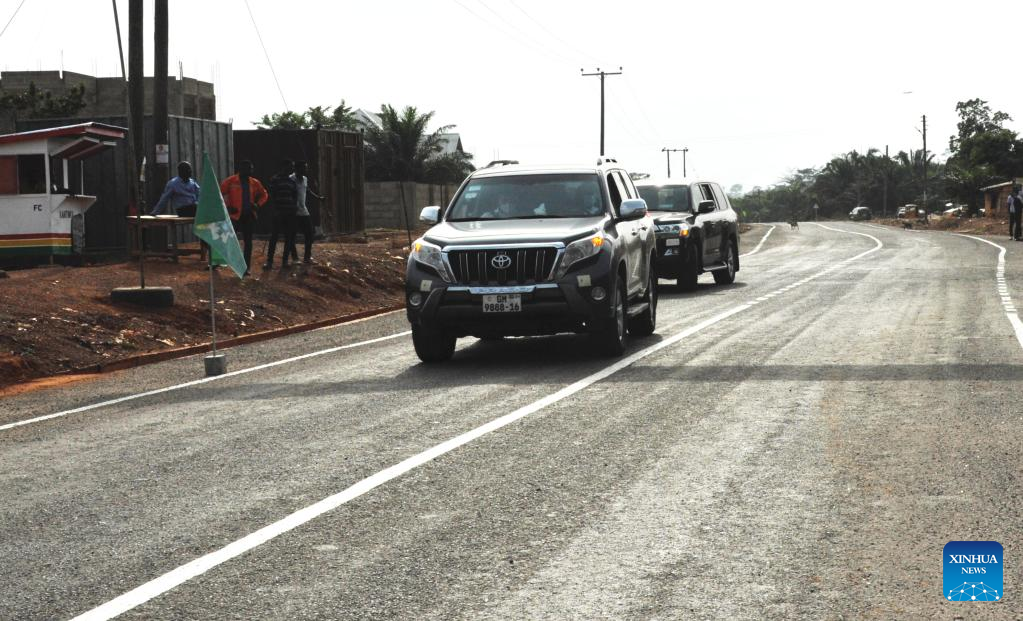 Vehicles are seen running at the Chinese-assisted road in southern Ghana's Ashanti Region, March 25, 2022. Ghanaian Vice President Mahamudu Bawumia on Friday commissioned a Chinese-assisted road project in Nyinahin, a town in southern Ghana's Ashanti Region.
