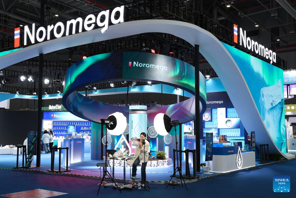 Staff members conduct a live streaming at the Medical Equipment & Healthcare Products exhibition area of the eighth China International Import Expo (CIIE) in east China's Shanghai, on Nov. 4, 2025. The eighth CIIE will be held in Shanghai from Nov. 5 to 10. (Xinhua/Fan Yuqing)