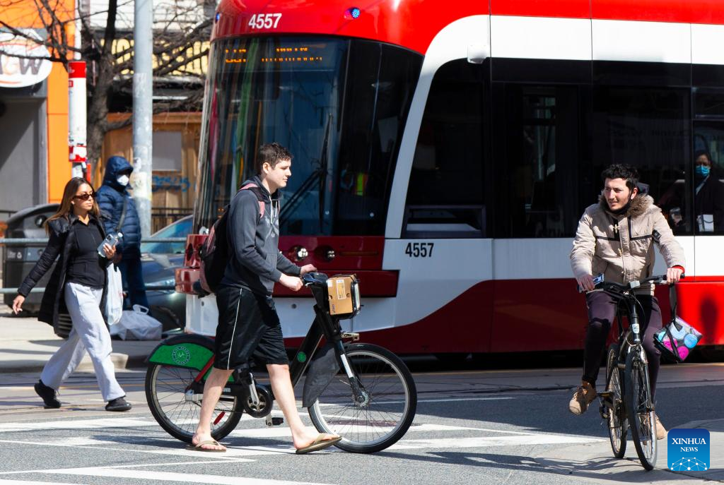People walk on a street in Toronto, Ontario, Canada, on March 21, 2022. Ontario's most long-standing measure of protection against COVID-19 lifted Monday, with masks no longer required to be worn in most indoor public areas, including schools, child-care and retail settings. (Photo by Zou Zheng/Xinhua)