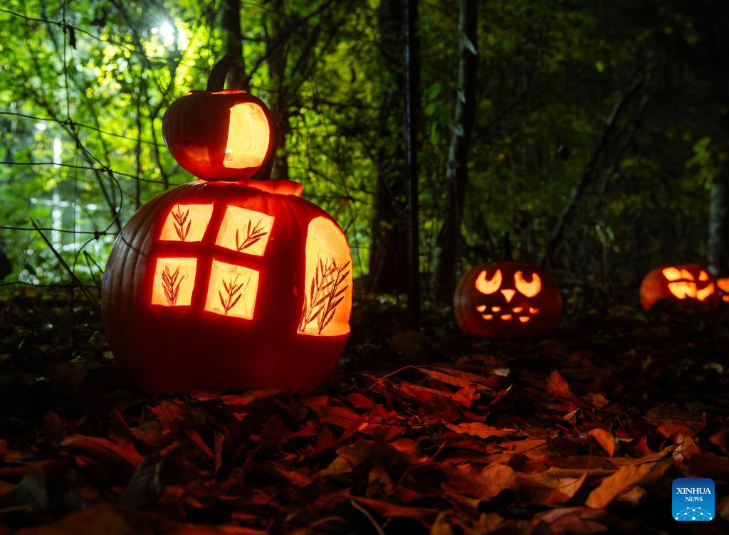 Jack-O-Lanterns are seen during a pumpkin parade event in a park in Mississauga, Ontario, Canada, on Nov. 1, 2025. (Photo by Zou Zheng/Xinhua)