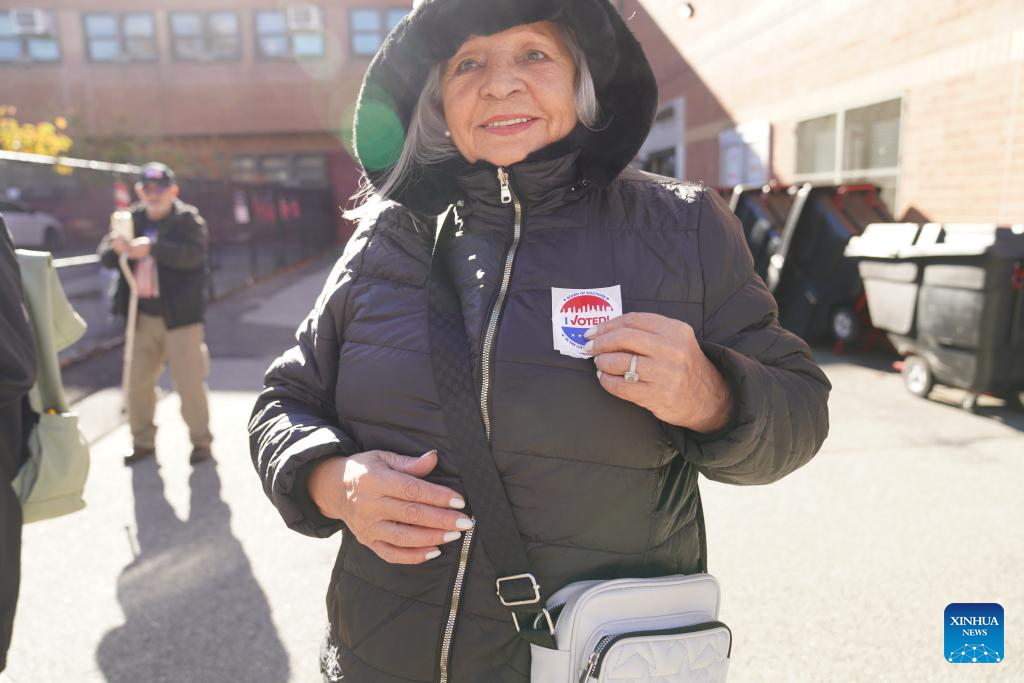 A woman shows a voted sticker outside a polling station in Queens, New York City, the United States, on Nov. 4, 2025. The New York City mayoral election took place on Tuesday. (Xinhua/Zhang Fengguo)