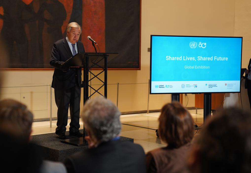 10月20日,在位于纽约的联合国总部,联合国秘书长古特雷斯在“共栖生命,共享未来”庆祝联合国成立80周年全球图片展启动仪式上致辞。