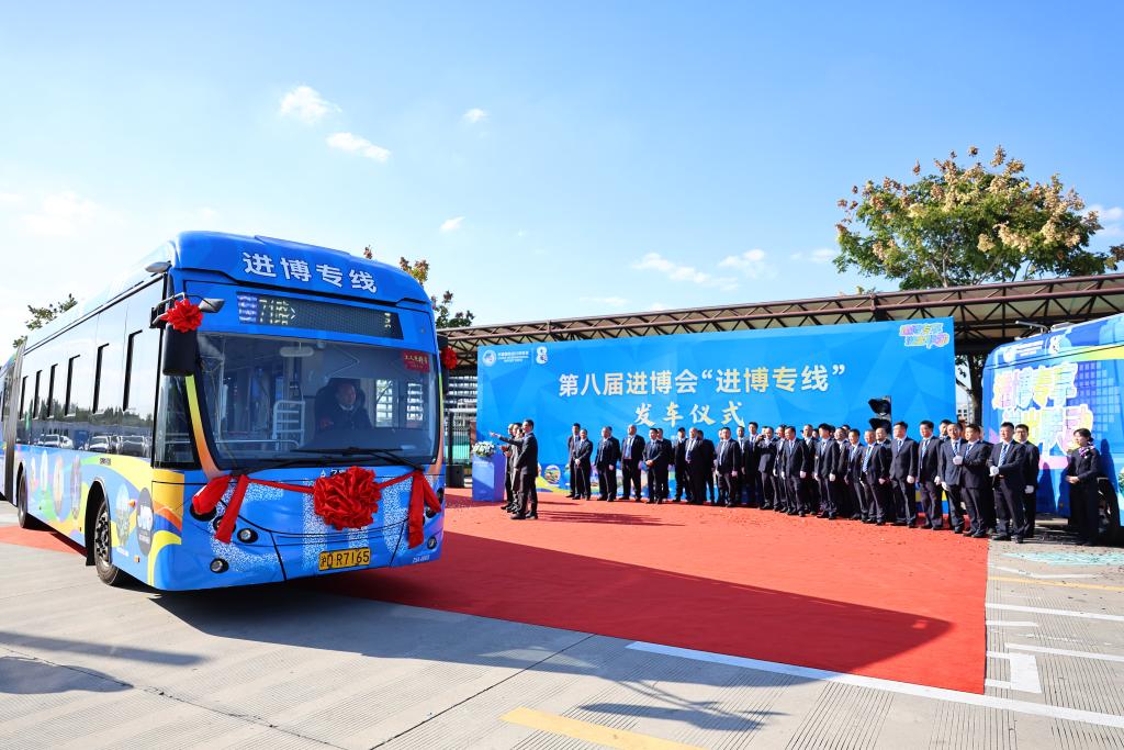10月29日,第八届进博会“进博专线”发车仪式在上海举行。8辆“进博专线”车采用以“进博蓝”为主色调的彩色车衣设计,除了为展客商提供从外滩到国家会展中心(上海)往返交通便利外,还将巡游于市中心区域,串联起淮海路、静安寺、徐家汇、北外滩等热门商圈。第八届进博会“进博专线”于11月1日至30日全月运行。