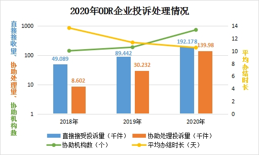 2020年,市場監(jiān)管部門大力推進(jìn)在線糾紛和解機制建設(shè),努力把消費糾紛化解在源頭、解決在基層、和解在企業(yè)。全國12315平臺共發(fā)展ODR企業(yè)2.55萬家,主動與消費者協(xié)商糾紛19.22萬件,與傳統(tǒng)調(diào)解方式相比,和解率高出6.21個百分點,平均處理時長縮短7.76天,消費者滿意度4.07分(滿分5分),ODR城市覆蓋率由25.60%增加到91.11%。與2019年相比,2020年ODR機制運行質(zhì)量有了明顯提高,投訴處理量、辦理效率、和解成功率、消費者滿意度等各方面均有明顯提升,維權(quán)效能日益突顯。