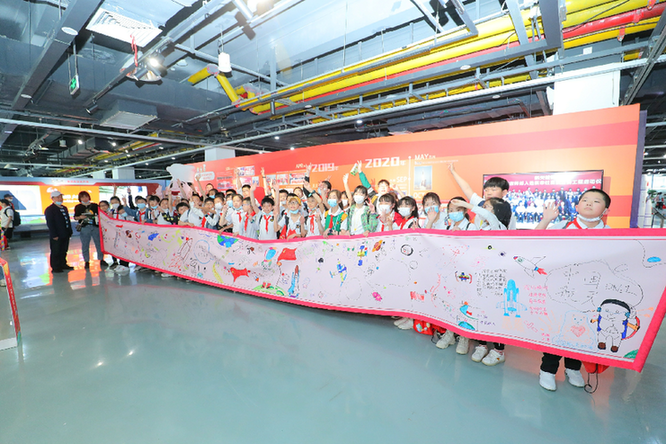 在現(xiàn)場,為了慶祝這場期待已久的航天科普展開幕,孩子們用一份“特別的禮物”——一幅繪滿了航天夢(mèng)想與武漢名勝的5米長卷獻(xiàn)禮中國航天。在這幅長卷上,孩子們不僅生動(dòng)地描繪出了武漢的眾多名勝特色,還用天馬行空的想象力展現(xiàn)了自己的航天夢(mèng)。展區(qū)內(nèi),孩子們?cè)谥v解員的帶領(lǐng)下參觀形形色色的“國之重器”,了解中國航天發(fā)展史,并且通過VR等設(shè)備親自體驗(yàn)了一把“太空旅行”。在航天夢(mèng)想體驗(yàn)營中,孩子們一起回顧了空間站發(fā)射的精彩瞬間,當(dāng)看到“長五B”成功升空時(shí),現(xiàn)場爆發(fā)出熱烈的歡呼和掌聲,加油聲此起彼伏,許多孩子還合唱《明天會(huì)更好》對(duì)中國航天獻(xiàn)上祝福。