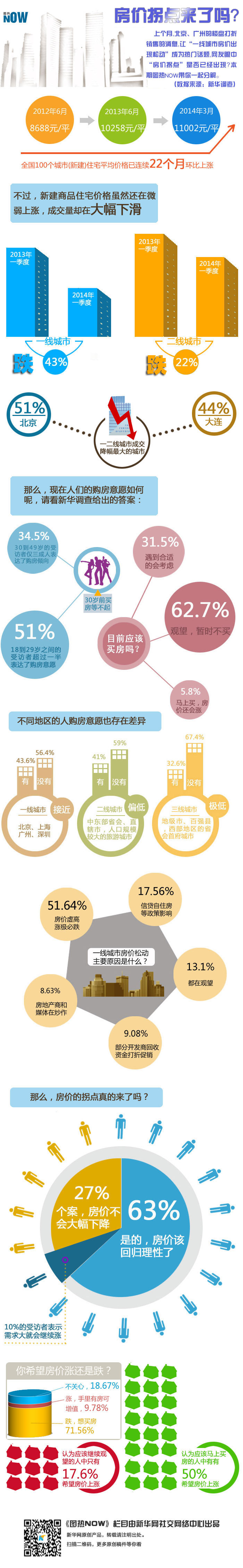 4月1日,中指院發(fā)布2014年3月中國(guó)房地產(chǎn)指數(shù)系統(tǒng)百城價(jià)格指數(shù)報(bào)告,在房?jī)r(jià)漲幅趨緩的同時(shí),成交量也大幅下滑,上個(gè)月,北京、廣州的樓盤(pán)打折銷(xiāo)售的消息,讓“一線城市房?jī)r(jià)出現(xiàn)松動(dòng)”成為熱門(mén)話(huà)題,“新華調(diào)查”欄目推出了“一線城市房?jī)r(jià)是否到了拐點(diǎn)?”的專(zhuān)題調(diào)查,那么,網(wǎng)友眼中“房?jī)r(jià)拐點(diǎn)”是否已經(jīng)出現(xiàn)?本期圖熱NOW帶你一起分解。