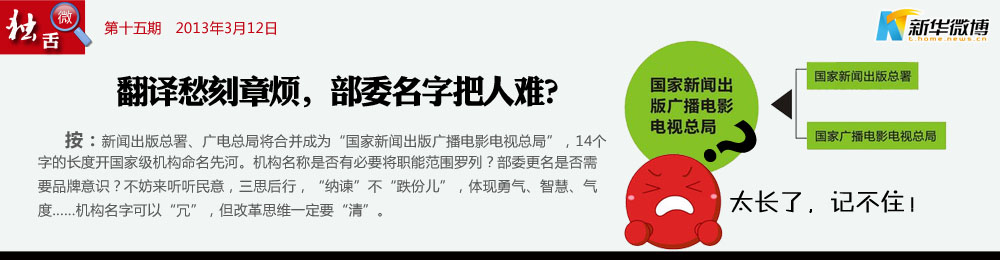 @霸氣外漏:【交通部也改了吧!】建議全稱為“國家新聞出版廣播電影電視微博微信彩信總管理局”,交通部應該為“國家汽車火車飛機輪船摩托自行車部” 。