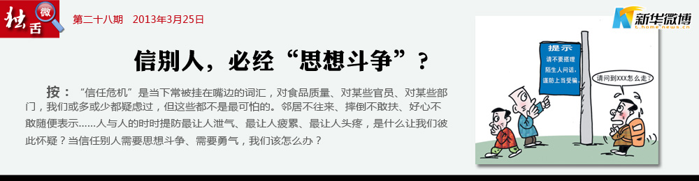 【可怕的“信任危機”】 賣包子的不吃自己做的包子,種菜的不吃自己種的菜,賣藥的不敢吃自己生產的藥,賣奶粉的則從不吃國產的奶粉……當造假作假成為一種風氣,甚至成為一種理所當然時,每個人能做的就只剩兩件事了:一個是只信自己,另一個是絕不信別人。