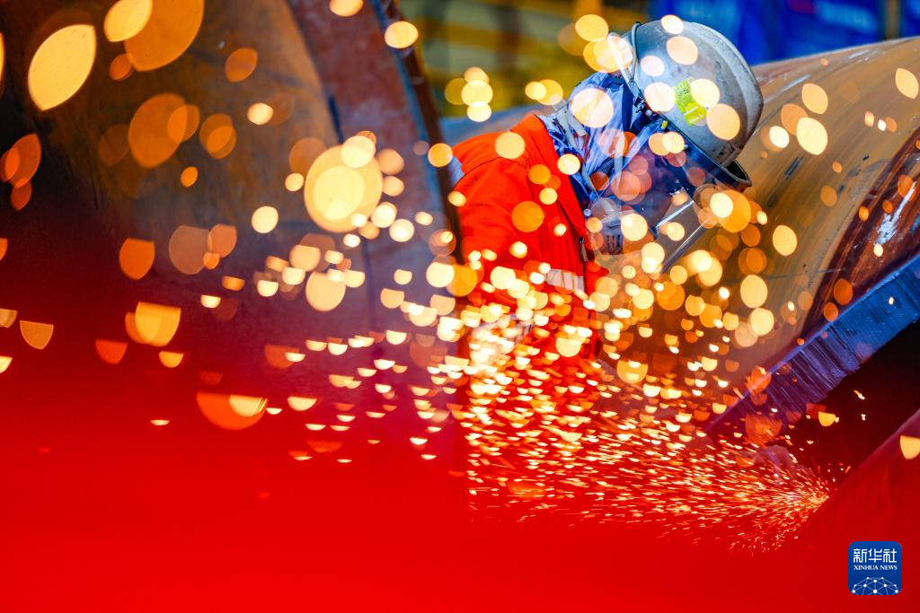 国庆中秋假期,各行各业的劳动者坚守在工作一线,在平凡的岗位上尽责奉献。这是10月1日,在天津市滨海新区,渤海油田工人进行打磨作业。