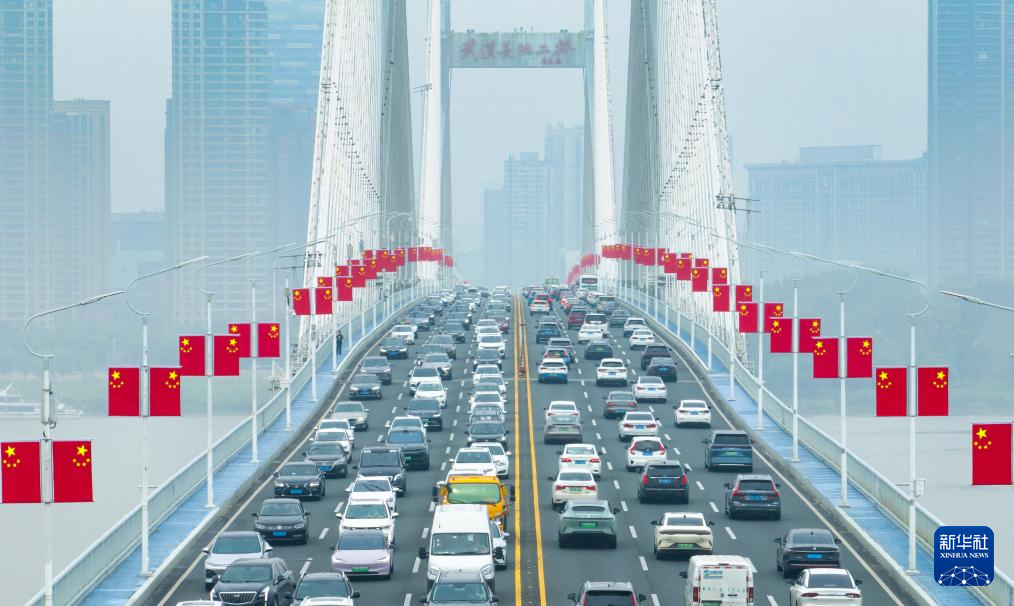 国庆假期第一天,各地迎来出行高峰。这是车辆行驶在湖北省武汉长江二桥上(无人机照片,10月1日摄)。