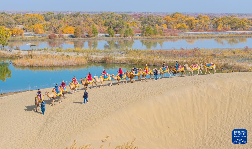 10月18日,游客在新疆巴音郭楞蒙古自治州尉犁县罗布人村寨景区东沙山体验骆驼骑行(无人机照片)。