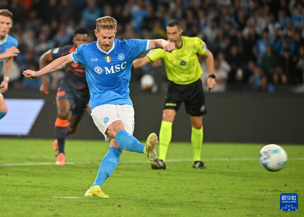 10月25日,那不勒斯队球员德布劳内(右三)在比赛中射入点球。
