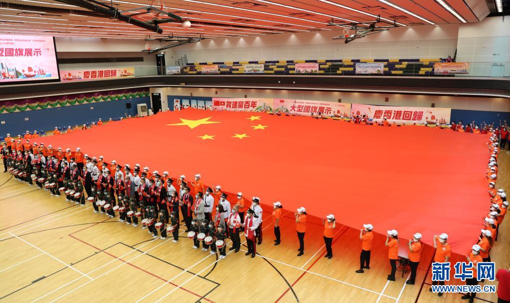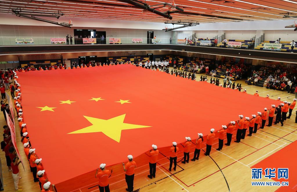 7月1日,在香港坑口體育館,香港市民展示大型國(guó)旗。新華社記者 李鋼 攝