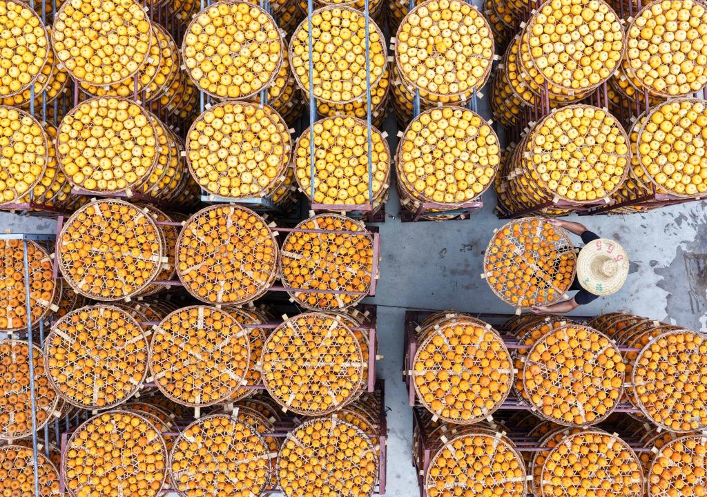11月1日,广西桂林市平乐县二塘镇牛角村村民在晾晒柿子(无人机照片)。