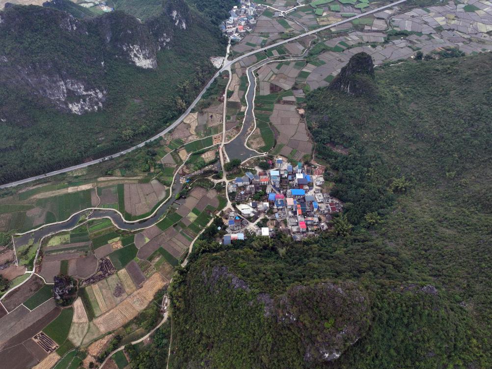 坐落在群山间的柳州市柳江区三都镇觉山村(2025年3月20日摄)。