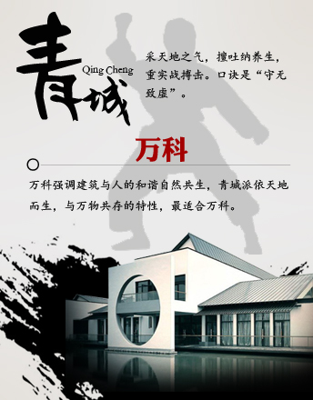 萬科 青城派 青城派擅長吐納養生,注重實戰搏擊。 萬科始終以穩健規范的經營作風著稱。強調建筑與人的和諧自然共生,青城派與自然萬物共存的特性,最適合萬科不過。